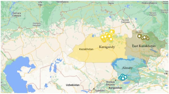 Map of the Republic of Kazakhstan showing the different agro-geographical regions and sampling sites during July 2019.