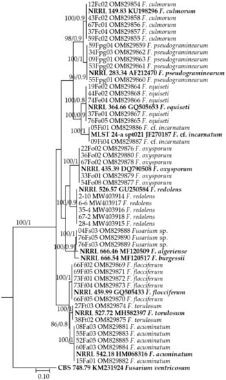 Phylogenetic tree based on maximum likelihood using IQ-TREE and Bayesian inference (BI) using MrBayes with EF1-α sequences of Fusarium isolates. At each node are the bootstrap values (left) and posterior probabilities (right). Sequences used as references and outgroups in the present study are presented in bold.