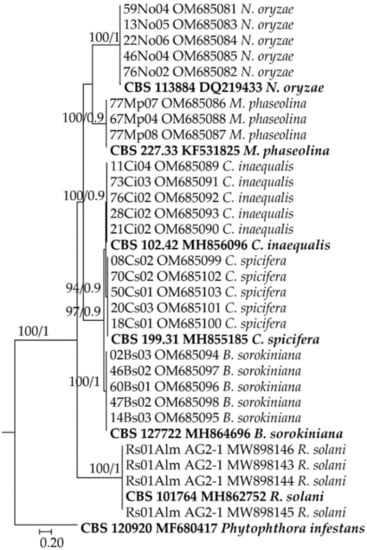 BLASTn queries based on the ITS of isolates showed that the sequences of isolates were 99–100% identical to those of the corresponding species in the GenBank database. The sequences were deposited in GenBank under the accession numbers shown in Figure 3. Phylogenetic analyses based on the ITS sequences of the isolates studied and reference sequences of B. sorokiniana, C. spicifera, C. inaequalis, M. phaseolina, and N. oryzae available in GenBank indicated that the isolates belonging to the same species were clearly separated in the dendrogram (Figure 3). GAPDH sequences of anamorphs of Cochliobolus were also 100% identical to those of the corresponding species and deposited in GenBank under accession nos. OM937370-OM937384.
