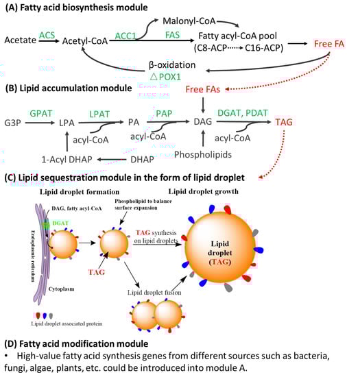 Figure 1. Four modules of lipid biosynthesis in yeast, including (A) fatty acid biosynthesis module, (B) lipid accumulation module, (C) lipid sequestration module in the form of lipid droplet, endoplasmic reticulum budding model of lipid droplet formation and expansion (redrawn with modifications from [29], and (D) fatty acid modification module.