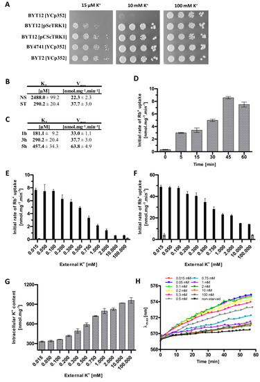 - Bertl, A.; Ramos, J.; Ludwig, J.; Lichtenberg-Frate, H.; Reid, J.; Bihler, H.; Calero, F.; Martinez, P.; Ljungdahl, P. Characterization of potassium transport in wild-type and isogenic yeast strains carrying all combinations of trk1, trk2 and tok1 null mutations. Mol. Microbiol. 2003, 47, 767–780. [Google Scholar] [CrossRef]