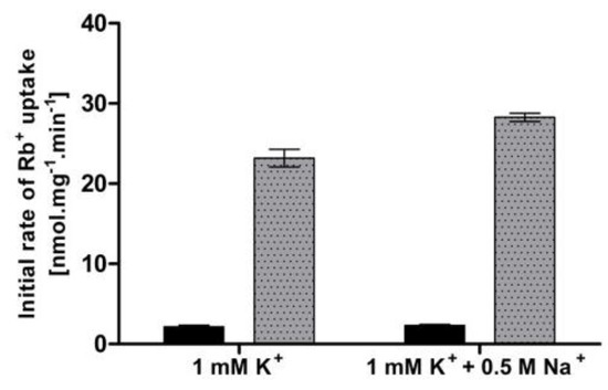 Apart from the limitations in external potassium concentration, an elevated external concentration of sodium has also been suggested to provoke a high-affinity state of Trk1 [16]. To verify whether we could observe a change in Trk1 affinity upon the addition of salt, we measured the uptake of Rb+ (50 µM or 5 mM, respectively) in the presence/absence of NaCl. The cells were pre-grown with 100 mM KCl and incubated in a YNB-F supplemented with 1 mM KCl (to ensure a medium-affinity state of Trk1 in conditions w/o NaCl) and with/without 0.5 M NaCl for 1 hour. In contrast to previously published data [16], we detected no significant difference in the initial rates of 50 µM Rb+ uptake, and only a very small difference in the 5 mM Rb+ uptake between cells incubated with and without NaCl (Figure 2). When we used the measured initial rates to calculate the rough estimates of KT, the obtained values were very similar (approx. 550 µM after incubation in 1 mM potassium and 630 µM after incubation in 1 mM potassium + 0.5 M sodium). Our results did not confirm the increase in Trk1 affinity because of the exposure to a high concentration of toxic sodium in cells with the BY4741 genetic background.