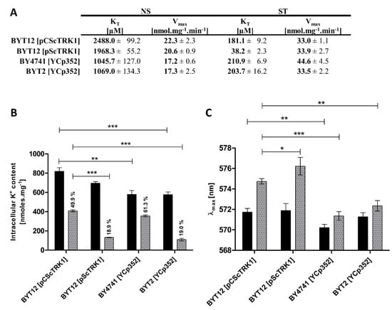 Differences in kinetic parameters, intracellular K+ content and membrane potential among strains. Cells expressing TRK1 either from chromosome (BY4741[YCp352] and BYT2 (trk2Δ)[YCp352]) or from centromeric (BYT12[pCScTRK1]) and multicopy plasmids (BYT12[pScTRK1]), respectively, were grown as described in Section 2, and used directly (non-starved (NS) cells) or first incubated in a YNB-F (15 μM K+, conditions of potassium starvation) for 1 h (starved (ST) cells). (A) Differences in kinetic parameters of Rb+ uptake. Initial uptake rates and kinetic parameters were estimated as in Figure 1B. (B) Intracellular K+ content. Three aliquots of NS (black columns) or ST (grey columns) cell suspension were withdrawn and the concentration of K+ in cells was estimated as described in Section 2. (C) Relative membrane potential. The membrane-potential measurement was performed as in Figure 1G with NS (black columns) and ST (grey columns) cells. The λmax reached after 50 min of staining is shown for each strain. Significant differences in (B,C) are indicated with asterisks (* p < 0.05; ** p < 0.01; *** p < 0.001).