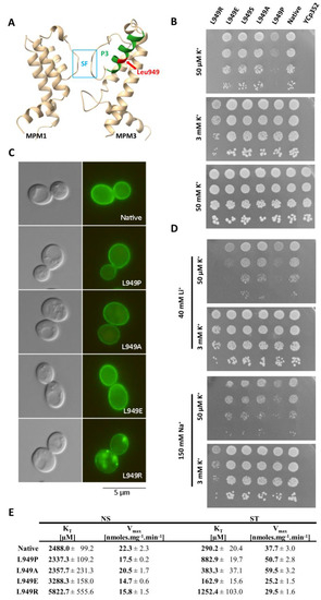 According to a 3D model of S. cerevisiae Trk1, Leu949 is localized approximately in the middle of a short P-helix (P3) of the third MPM motif, and is, thus, situated close to the region of the selective filter (SF) and potassium binding site (Figure 4A and reference [11]). We, therefore, assumed that the substitutions of Leu949 could have a significant effect on the conformation of helix P3 and consequently on the structure of the entire region of the selectivity filter, which could presumably affect potassium uptake as such. To more closely characterize not only the mutation L949P, but also the importance of leucine at this position, we performed site-directed mutagenesis replacing Leu949 with proline, alanine, glutamic acid, arginine, and serine. The BYT12 cells were transformed with the resulting plasmids (cf. Table S2), and the effects of these substitutions on the functionality, subcellular localization and kinetic parameters of Trk1 were studied.