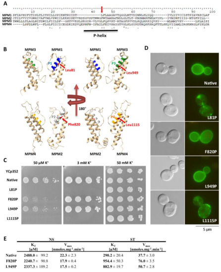 As Trk1 contains four MPM domains, we decided to test the effects of similar mutations (the introduction of a prolyl residue) in the other three P-helices. The amino-acid residues for substitution were selected according to a sequence alignment of all four MPM domains (Figure 5A). The amino-acid residues corresponding to Leu949 were Leu81, Phe820 and Leu1115 (Figure 5B), and their replacement with proline was performed by site-directed mutagenesis of the TRK1 gene in the pCScTRK1 and pCScTRK1-GFP plasmids, respectively (Table S2).