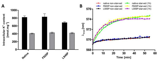 As mentioned in previous sections, intracellular potassium content and membrane potential might play a role in the regulation of the changes in Trk1 kinetic parameters. To distinguish whether the mutations F820P and L949P prevent the increase in Trk1 affinity due to alterations in the transporter’s functionality, or whether they disrupt overall potassium homeostasis, thus, affecting the regulatory signal for an increase in affinity, we estimated both the intracellular potassium content and relative membrane potential in non-starved and starved cells expressing the native and mutated versions, respectively. As shown in Figure 6, both the intracellular potassium content and accumulation of the potentiometric probe were almost the same in cells expressing either the native or F820P or L949P versions of Trk1. These results led us to conclude that the inability of Trk1, with the substitutions F820P and L949P, to properly increase its affinity upon potassium starvation is a consequence of the alterations in protein structure and functionality, rather than the absence of a regulatory signal.