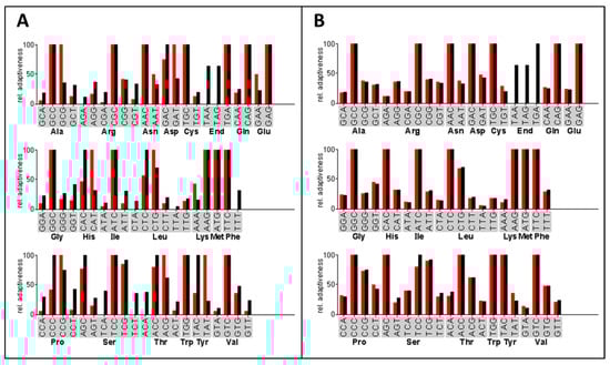 Example of the codon-optimizing process. Shown is the codon usage between the ccaC gene and the A. chrysogenum genome before (A) and after (B) codon optimization. The red bars represent the relative codon usage of the ccaC gene from Pseudomonas sp. GK16, the black bars indicate that of the A. chrysogenum genome database. The relative adaptiveness values of the various codons coding the same amino acid were normalized such that the most abundant one is 100%.