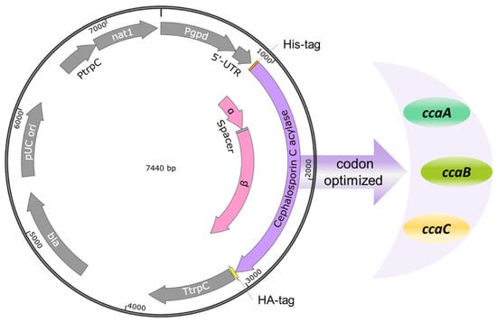The expression of heterologous genes in filamentous fungi was previously optimized by using synthetic genes with a codon-optimized open reading frame [34,52]. For the efficient expression of the three bacterial acylase genes in A. chrysogenum, we designed codon-optimized genes ccaA, ccaB, and ccaC to ensure adequate tRNA supply during the protein translation process in the fungal host (Figure 1). The frequency of each codon used in the optimized ccaC gene is close to that of the A. chrysogenum genome. The mean difference in the entire codon usage between A. chrysogenum and the bacterial ccaC gene was considerably reduced from 21.09% to 5.53% (Figure 1). Simultaneously, the GC content of the codon-optimized genes was adjusted to around 61% to adapt to the high GC content of coding sequences found in A. chrysogenum [45]. Codons were similarly optimized for the ccaA and ccaB genes (Figure S1).