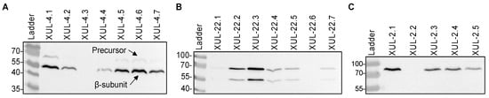 For enzymatic activation, autocatalytic cleavage of the CCA enzyme is necessary, where the precursor polypeptide is cut into an α-subunit and β-subunit through a series of hydrolytic reactions led by the Ser1β amino acid [19,55,56,57]. For CCAA and CCAB transformants, we succeeded in detecting proteins bands resembling the β-subunit (60 kDa), which emerged after cleavage. The precursor polypeptide bands (79 kDa) were also detected, but with lower signal intensity (Figure 3A,B). These results verify that the bacterial cca genes were successfully expressed in A. chrysogenum. Only CCAC was unable to undergo autocatalytic cleavage in the fungal cell and was thus excluded from further analysis (Figure 3C). In all our Western blot analyses, we failed to detect the α-subunit from CCAA and CCAB.