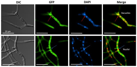 Microscopic investigations were conducted using an Axio Imager M1 microscope (Zeiss; Oberkochen, Germany) as described recently [35,40]. Recombinant strains expressing EGFP-CCAA, were grown in liquid CCM medium for 72 h. Microscopic detection was performed on microscope slides with 10 µL of vegetative mycelia diluted with the same volume of 0.9% NaCl solution. Nuclei and mitochondria were stained with DAPI in a 5 mg/mL concentration diluted in 0.9% NaCl solution. Images were acquired and analyzed using Metamorph software (Version 7.7.0.0; Universal Imaging, Bedford Hills, NY, USA).