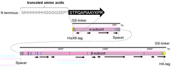 Protein MS detected several peptides from all parts of the enzyme (Figure 5; Supplementary MS Table). Due to the high sensitivity of protein MS analysis, we were able to detect peptides covering around 48% of the CCA in transformants producing either CCAA or CCAB. The most unexpected finding was that the first peptide from the N-terminus of the α-subunit, generated from trypsin digestion, was truncated (Figure S8A; Supplementary MS Table). The detected peptide sequence was STPQAPIAAYKPR, instead of the expected sequence MHHHHHHHGGGGSEPTSTPQAPIAAYKPR. Apparently, the HisX6-tag, the GS-linker, and three amino acids (EPT) of the α-subunit are removed after protein translation. This N-terminal amino acid truncation may explain why we were unable to detect the α-subunit in Western blots. However, most of the remaining parts of the α-subunit were detected. These include the complete peptides at the C-terminus of the α-subunit, confirming the accurate cleavage between the α-subunit and spacer (Figure S8B). Many peptides representing the β-subunit were also confirmed to be correctly synthesized. Remarkably, the final peptide generated by the trypsin digestion contained the full sequence of the HA-tag. However, the low number of peptide sequence matches (PSMs) of CCA-peptides compared to other proteins identified in the gel slices may indicate a low abundance of the CCA protein.