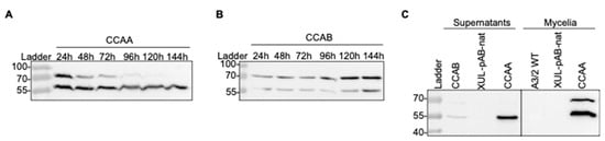 Next, we asked how acylase precursors are processed in mycelial protein extracts. We followed the time course of the expression and cleavage process of CCAA and CCAB from mycelia harvested after up to 144 h in culture (Figure 6A,B). Two strains expressing the ccaA or ccaB genes (XUL-4.6 and XUL-22.3) were selected for further investigations due to their high CCAA and CCAB production levels (Figure 3A,B). The cleavage process continued gradually and was completed by the end of the chosen culture time (144 h). The amount of CCAA β-subunit was maintained at a high level, which is potentially a part of the active CCAA enzyme in fungal culture (Figure 6A). In contrast, CCAB production was slower than that of CCAA. The strongest protein precursor signal was observed after 144 h of culture (Figure 6B). The cleavage process was also slower. The highest amount of the β-subunit was detected after 144 h and represented approximately half the amount of the enzyme precursor.