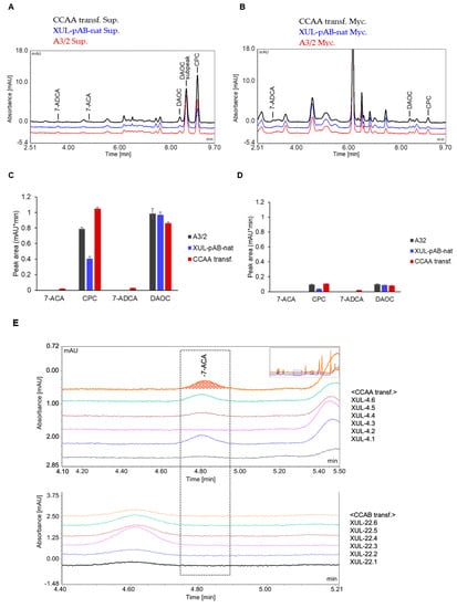 HPLC analysis of fungal mycelia and culture supernatants to separately detect compounds related to the CPC biosynthesis pathway. (A) HPLC spectrum of fungal culture supernatants. (B) HPLC spectrum of concentrated mycelial extracts prepared as described in the Materials and Methods section. (C,D) HPLC peak areas of selected substances detected in the supernatants (C) and mycelial samples (D). (E) Detection of 7-ACA in the culture supernatants of randomly selected CCAA and CCAB transformants as indicated. For HPLC measurements, fungal mycelia and culture supernatants from 6 days cultures were separated by vacuum filtration. The sample preparation process was followed as described in the Material and Methods section.