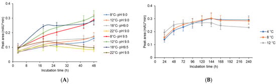 All 7-ACA levels showed upward trends at 8 °C, 12 °C, and 18 °C. However, at an incubation temperature of 22 °C, net 7-ACA production decreased after 20 h of incubation at both pH values, 9.0 and 9.5. The instability of CPC and 7-ACA was more obvious with a longer period of exposure at a higher temperature (Figure S5).