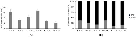 Both 7-ACA and CPC contents in the culture supernatants were converted to molar concentrations, and the molar ratio between 7-ACA and CPC was presented as a 100% stacked column (Figure 9B). Considering one molecule of 7-ACA is produced from one molecule of CPC, and neglecting differences in degradation, the ratios displayed in Figure 9B indicate the conversion rate of CCAA. Eventually, the one-step conversion rate of CCAA reached 30% for at least 2 strains (XUL-4.6 and XUL-4.2).