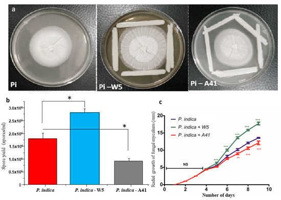 To study the interaction among P. indica, A. chroococcum, and O. sativa, we used two different strains of A. chroococcum: strain W5, which was originally isolated from the rhizosphere of wheat, and strain A41, which was received from the Department of Microbiology, Indian Agricultural Research Institute (IARI), New Delhi, India. The P. indica strain was gifted by Dr. Narendra Tuteja (International Centre for Genetic Engineering and Biotechnology (ICGEB), New Delhi, India), and was grown and maintained on Hill and Kaefer medium [35]. To examine the respective interactions of W5 and A41 with P. indica, plates containing Hill and Kaefer medium and agar were first inoculated in the center, with the fungal agar plug (5 mm) obtained from a freshly grown culture of P. indica and incubated at 28 °C in dark conditions. After two days of incubation, the two A. chroococcum strains were streaked separately on each plate’s periphery. The effect of the bacterial strains was determined by comparing the radial growth pattern and the spore yield of P. indica.