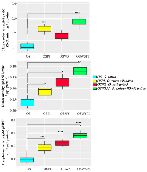 A similar result was obtained for the urease activity that was enhanced in the presence of respective inoculants, whereas W5 was found to be more potent in enhancing the enzyme activity as it was 1.4-fold higher than the control vs. P. indica (1.2-fold higher). In co-inoculation, the influence of the microbes was alike to the nitrate reductase, with nearly a 1.6-fold increase in activity of the urease. These results support the hypothesis that in co-inoculation experiments, nitrogen is more easily acquired by the plant in comparison to the seedlings grown under single inoculation or without any microbial inoculant. A similar trend was observed for the phosphatase activity, as phosphatase activity was higher in the presence of W5 (2.3-fold) compared to mock control or inoculation with P. indica, where the phosphatase activity was 1.9-fold higher than the control. Upon co-inoculation, the phosphatase activity was enhanced and highly significant (p-value < 0.0001), with a nearly 3-fold increase in the accumulation of phosphate (Figure 2).