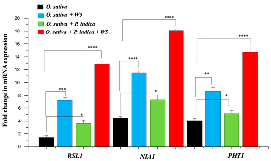 Figure 3. Changes in the expression of selected O. sativa genes RSL1, NIA1, and PHT1 observed 96 HPI with P. indica and W5 individually or in co-inoculation. Values represented as mean ± se. (n = 3, p-value * ≤ 0.05, ** ≤ 0.01, *** ≤ 0.001 and **** ≤ 0.0001) compared with control (P. indica). Standard error (SE) is represented by error bars.