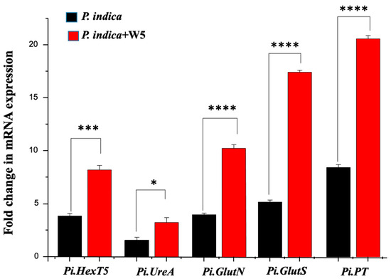 Figure 4. Relative fold changes of the P. indica genes Pi.HexT, Pi.UreA, Pi.Glut.N, Pi.Glut.S, and PiPT observed in-vivo within O. sativa roots 96 HPI with P. indica either in the presence or absence of W5. Values signifies the mean of replicates (n = 3, p-value * ≤ 0.05, *** ≤ 0.001 and **** p ≤ 0.0001) compared with P. indica. Standard error (SE) is represented by error bars.