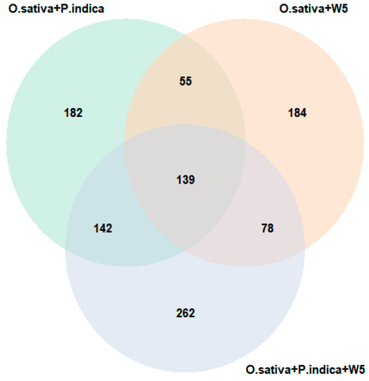 A total of 3511 O. sativa proteins (Supplementary Table S1) were identified at 21 DPI based on LC-MS analysis in all the three treatments. DAPs were identified using the p-value < 0.05 and log2fold-change (log2FC) equal to or more than 0.5, and equal to or less than −0.5, resulting in the identification of 527, 455 and 604 DAPs in O. sativa inoculated with P. indica, W5, or both, respectively (Supplementary Table S1). Among these, 182 were specific to O. sativa inoculated with P. indica, 184 were specific to O. sativa inoculated with W5, and in co-inoculation with P. indica and W5 a total of 262 specific DAPs were observed. A total of 139 DAPs were common for all three sets (Figure 5). Some DAPs that were identified in the different treatments showed very high p-values and a higher fold change value, as shown in volcano plots (Figure 6a–c). However, GO annotation for most of these are not available. One DAP exhibiting peroxidase activity was common to all the treatments with a p-value of 2 × 10−50. This finding was similar to previous reports on tobacco, where there was a transient increase in peroxidase in mycorrhizal roots [46]. The Venn diagram revealed that most DAPs were exclusively expressed in O. sativa co-inoculated with W5 and P. indica. This trend was consistent with our hypothesis that during co-inoculation there are higher levels of proteomic changes, as it involves the action of both the endophytic fungus and the PGPR.