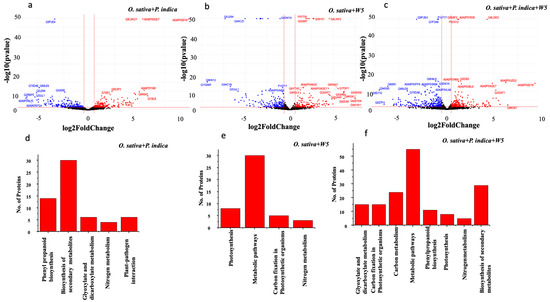 Figure 6. Significantly differentially abundant proteins with 0.5-fold up and down regulation and KEGG pathway enrichment. (a) Volcano plot for the differentially abundant proteins identified in O. sativa when inoculated with P. indica after 21 days of interaction. Proteins that were significant (p-value < 0.05) and upregulated are indicated by the color red, significantly downregulated proteins are indicate d by the color blue, and the color black indicates DAPs that were insignificant. (b) Volcano plot of DAPs in O. sativa inoculated with W5. (c) Volcano plot of DAPs in O. sativa co-inoculated with W5 and P. indica. (df) KEGG pathway enriched (p-value p < 0.05) by upregulated DAPs in O. sativa inoculated with P. indica, W5 alone, and in combination of both.