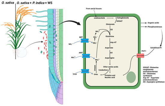 The absorption of nitrogen, which is an essential mineral nutrient for the plants, takes place through the roots from the soil in various forms such as ammonium (NH4+) and nitrate (NO3) ions [70]. We observed that after mycorrhization by fungi in rice plants, N is acquired by plant roots via active transport through the plasma membrane of epidermal and cortical cells. N is utilized by plants for a variety of metabolic processes, including the biosynthesis of amino acids by glutamine synthetase and glutamine synthetase (GS-GOGAT). It is further used for the synthesis of other amino acids by the activity of aminotransferase, and these amino acids are used in protein synthesis resulting in molecular and physiological changes. Urease, an enzyme that is involved in the degradation of urea into ammonia and carbon dioxide, plays a vital role in ammonia assimilation, as urea is produced inside the plant cell by catabolism of arginine. Another source of urea is rhizosphere, where urea is supplied mainly as a fertilizer and transported inside the cell by the action of membrane transporters. Similarly, phosphorous is solubilized and assimilated in plants through the action of organic acids and phosphoesterase secreted by plants, which then becomes upregulated in the presence of P. indica and A. chroococcum. Organic acids and phosphatases (here phosphoesterase) solubilize various phosphate containing substrates in the rhizosphere. Transporter proteins like PHT1, the expression of which is increased in the presence of endophyte P. indica and PGPR A. chroococcum strain W5, are involved in the transport of phosphate by roots from the external rhizosphere to the inside of the plant cell (Figure 7). Presence of inoculants in the soil also upregulate the expression of genes that in turn increases the root hair formation, resulting in enhanced absorption by the roots. These changes are brought by accelerating the production of hormones and metabolites [71], which are responsible for higher growth and biomass production. Thus, besides improving the nutritional uptake in plants, A. chroococcum also plays an important role in stabilizing the plant and endophyte association by solubilizing nutrients and promoting growth of endophytic fungi, leading to improved plant growth.
