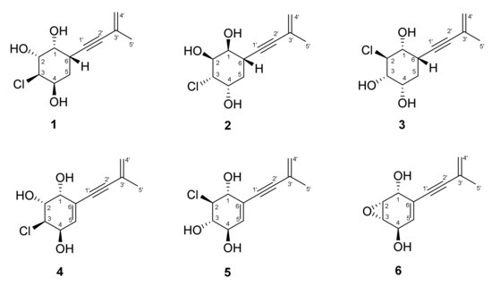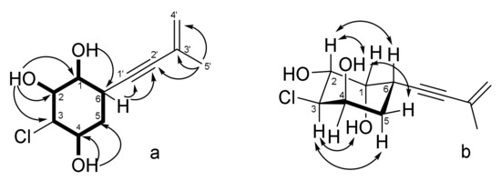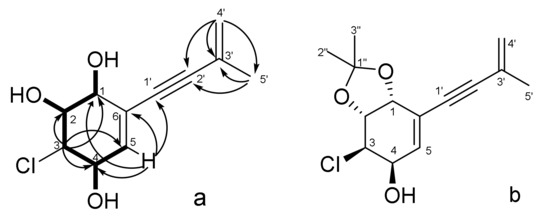 The HMBC correlations (Figure 4) from H-3 (δH 4.25) to C-1 (δC 67.9), C-2 (δC 68.6), C-4 (δC 65.1) and C-5 (δC 136.0); from H-5 (δH 5.92) to C-1, C-4, C-6 (δC 123.5) and C-1′ (δC 88.2), and from OH-4 (δH 5.25) to C-4, C-5, together with 1H–1H COSY correlations of H-1(OH)/H-2(OH)/H-3/H-4(OH)/H-5, indicated the presence of a penta-substituted cyclohexene ring with ∆5,6 double bond, the location of the hydroxy groups at C-1, C-2, C-4 and a chlorine atom at C-3 in 4. The structure of the 3-methyl-3-buten-1-ynyl side chain and its position at C-6 in 4 were determined by HMBC correlations (Figure S41), as for acrucipentyn A (1).