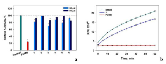 The effect of compounds 1–6 on sortase A enzymatic activity. (a) The effect of compounds 1–6 on sortase A enzymatic activity measured after 10 min of incubation with the substrate. (b) The time-dependent effect of compound 3 (50 μM) on sortase A enzymatic activity. Data presented as relative fluorescent units (RFU). DMSO (0.8%) did not show any inhibition activity in comparison with sortase A assay buffer and was used as a control. The sortase inhibitor—4-(hydroxymercuri)benzoic acid (PCMB) in DMSO 0.8% was used as a positive control. All experiments were performed in three independent replicates and the data presented as a mean ± standard error mean (SEM). * indicates the significant differences with p ≤ 0.05.
