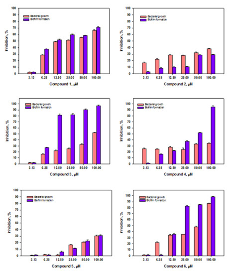 When studying the effect of compounds 1–6 on the ability to inhibit the biofilm formation by Gram-positive bacteria S. aureus, it was noted that compounds 3, 4, and 6 have the most pronounced inhibitory activity at a concentration of 100 μM, in the case of which the formation of biofilms is almost absent. A high level of inhibition of biofilm formation in the case of substances 3 and 6 is kept up to concentrations of 12.5 and 25 μM, respectively. When substance 4 is diluted twice, its effect on biofilm formation is halved. Compound 1 inhibits the biofilm formation at concentrations of 12.5–100 μM by 50–70%, respectively. Compounds 2 and 5 at a concentration of 100 µM inhibited biofilm formation by 30%.