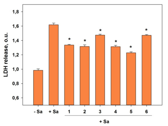 In normal conditions, LDH weakly releases from cells to culture media. S. aureus caused a significant increase in the LDH release from keratinocytes during co-cultivation. The addition of compounds 1–6 at a concentration of 10 μM reduced the LDH release by 30–50%. The greatest effect was registered for compounds 1, 2, 4, and 5.