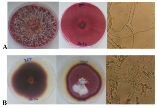 Morphological characteristics of Fusarium sp. isolated from asymptomatic Tunisian durum wheat grains. Observation of mycelial colonies and macroconidia grown on PDA. (A) 3T isolate representing the first morphotype after incubation at 25 °C for 7 days. (B) 32T isolate representing the second morphotype, after incubation at 25 °C for 11 days. Spores were observed under an optical stereomicroscope (Magnification 2000×).