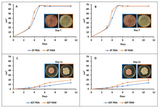 The mycelial growth rates on both culture media helped to discriminate between the two sets of strains. It can be observed that 3T and 4T covered the plates after 5 days of incubation at 25 °C, both on FDM-agar and PDA (Figure 2A,B). The two other isolates, 32T and 33T, showed slower growth. Furthermore, almost a 30% higher growth was observed on FDM-agar than on PDA after 11 days, the colonies reached 19.7 cm² on FDM-agar and 13.5 cm² on PDA (Figure 2C,D).