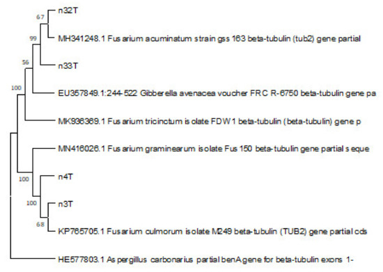 The PCR product obtained was sequenced by the company GENEWIZ (Leipzig, Germany). Nucleotide sequences were aligned using the Clustal W algorithm in BioEdit 7.0 software. Sequence similarity searches were performed with BLAST (basic local alignment search tool) against NCBI public database (www.ncbi.nlm.nih.gov/genbank, 15 March 2022). Further, dendrograms were constructed using the MEGA-X program (MEGA-X: Molecular Evolutionary Genetics Analysis version 10.0.5 (Tamura, Stecher, and Kumar, 1993–2020) and original sequences of target species and nucleotide sequences (target and other species of the genus Fusarium) from the NCBI database were used: original nucleotide sequences of DNA sites (Beta Tubulin)—F. acuminatum (MH341248), F. avenaceum (EU357849), F. tricinctum (MK936369), F. culmorum (KP765705), and F. graminearum (MN416026). In addition, Aspergillus carbonarius (HE577803) was used as an outer group. The sequences of the four isolates from this study have the following numbers in GeneBank: 3T = ON128289, 4T = ON128290, 32T = ON128291, 33T = ON128292. The data are presented as a consensus phylogenetic tree using the unweighted pair group (UPGMA) method. Branches corresponding to partitions reproduced in less than 50% bootstrap replicates are collapsed. The percentage of replicate trees in which the associated taxa clustered together in the bootstrap test (100 replicates) are shown next to the branches. The evolutionary distances were computed using the Maximum Composite Likelihood method and are in the units of the number of base substitutions per site. This analysis involved 10 nucleotide sequences. Codon positions included were 1st + 2nd + 3rd + Noncoding. All ambiguous positions were removed for each sequence pair (pairwise deletion option).