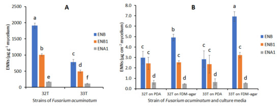 Accumulation of enniatins by F. acuminatum 32T and 33T in different culture media measured after 11 days of culture at 25 °C. (A) = culture in FDM liquid medium, (B) = culture on PDA and FDM-agar medium. Values are means of triplicates. Error bars are ± standard deviation. Means with the same lowercase letter are not significantly different (p < 0.05).