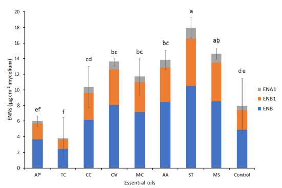 As in Figure 4B, the isolate 33T did not produce ENA in the FDM-agar medium (control) and 62% total ENNS were ENB; less than 10% were ENA1 (Figure 6). The ratios between the ENNS were not significantly affected by the EO treatments but the produced levels varied. Significant induction of the production of ENNs was observed with EOs having no or low effects on mycelial growth rates (inhibition < 40%), except C. carvi EO, which did not differ from the control (Figure 6), while a significant decrease in ENNs’ accumulation was observed when F. acuminatum 33T was exposed to TC EO treatments with a reduction level reaching 52%. With AP EO, the reduction level was 26%, but the difference with the control was not significant (Figure 6).