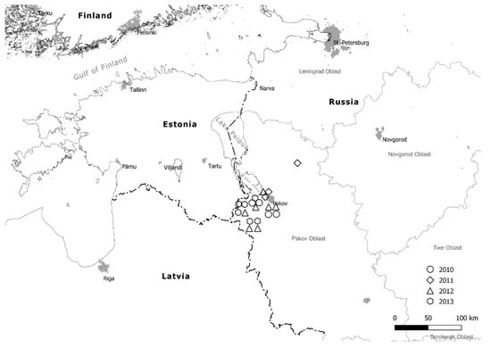 Map of Pskov region potato fields in north-west Russia where the isolates of Phytophthora infestans were collected during 2010–2013.