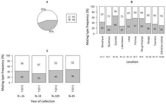 Mating types (A1, A2) frequency among P. infestans isolates collected from Pskov region in north-west Russia during 2010–2013. (A) For all isolates. (B) For locations. (C) For sampling years.