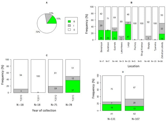 Metalaxyl resistance among P. infestans isolates collected from Pskov region in north-west Russia during 2010–2013. (A) For all tested isolates. (B) For locations. (C) For sampling years. (D) For A1 and A2 mating type. R: resistant, I: intermediate, S: sensitive. Note: Number in parenthesis in Figure 3B is the number of isolates.