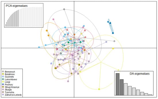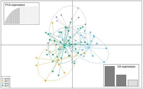 - Jombart, T.; Devillard, S.; Balloux, F. Discriminant analysis of principal components: A new method for the analysis of genetically structured populations. BMC Genet. 2010, 11, 94. [Google Scholar] [CrossRef] [Green Version]