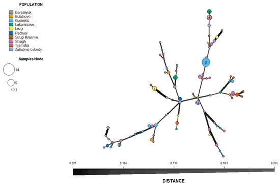 Minimum spanning network (MSN) inferred from simple sequence repeat (SSR) markers of P. infestans collected from ten locations (non-clone corrected) of Pskov region in north-west Russia during years 2010–2013. Each node represents multilocus genotypes (MLGs) and the size is proportional to the number of individuals sharing the same SSR allele profile. The thickness of the lines represents the Bruvo’s genetic distance between two nodes (the further the genetic distance the lighter the color and thinner the line). MLGs from the same location are color-coded.