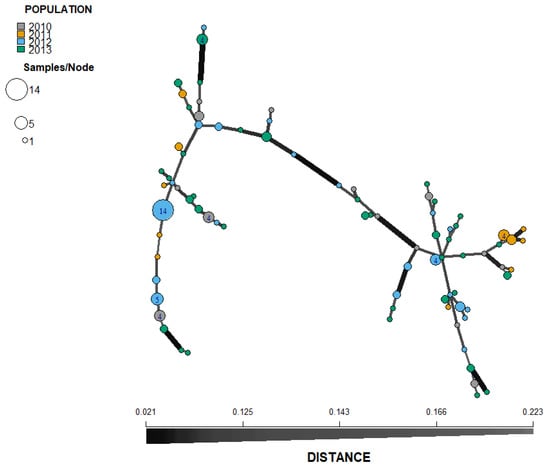Minimum spanning network (MSN) inferred from simple sequence repeat (SSR) markers of P. infestans (non-clone corrected) collected from Pskov region in north-west Russia during four year period (2010–2013). Each node represents MLGs and the size is proportional to the number of individuals sharing the same SSR allele profile. The thickness of the lines represents the Bruvo’s genetic distance between two nodes (the further the genetic distance the lighter the color and thinner the line). MLGs from the same year are color-coded.