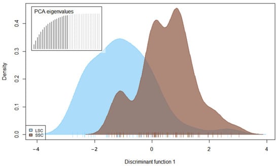 A discriminant analysis of the principal components (DAPC) of P. infestans isolates (non-clone corrected) collected on large-scale conventional farm (LSC) and small-scale farm (SSC). DAPC fails to discriminate between populations. Colors indicate population. The cross-validated number of the PCs used for the discriminant analysis is shown in the bar plots on the top left of the density plot. A total of 20 PCs explained 99.1% of the variation.