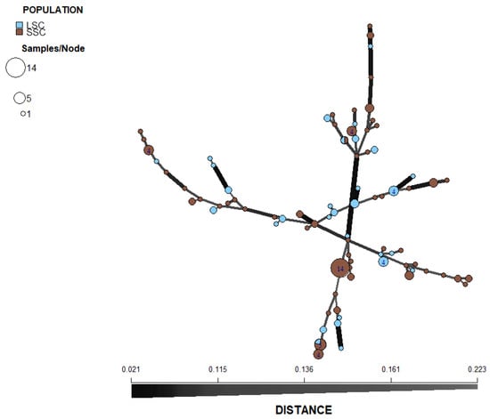 Minimum spanning network (MSN) inferred from simple sequence repeat (SSR) markers of P. infestans (non-clone corrected) collected on large-scale conventional farm (LSC) and small-scale farm (SSC). Each node represents multilocus genotypes (MLGs) and the size is proportional to the number of individuals sharing the same SSR allele profile. The thickness of the lines represents the Bruvo’s genetic distance between two nodes (the further the genetic distance the lighter the color and thinner the line). MLGs from the same agricultural management practice are color-coded.