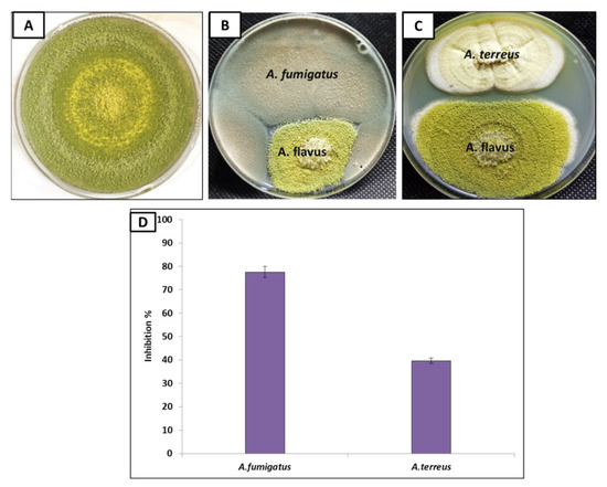 Fungi have the ability to perform mycoparasite interaction with other fungi, where they can produce secondary metabolites that could control the growth of other pathogenic fungi [63,64]. Consequentially, fungal endophytes A. fumigatus and A. terreus were used to inhibit the growth of aflatoxin, producing A. flavus (Figure 3B,C). The results revealed that both A. fumigatus and A. terreus reduced A. flavus growth, where A. fumigatus was more efficient than A. terreus. Moreover, the inhibition percentage of A. fumigatus against A. flavus was 77.60%, while in the case of A. terreus, it was 39.70% (Figure 3D). Therefore, fungal endophyte A. fumigatus was selected for further experiments.
