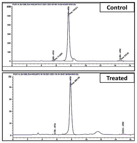 HPLC chromatogram of aflatoxin level in control (infected maize with A. flavus) and treated (infected maize treated with endophytic A. fumigatus).
