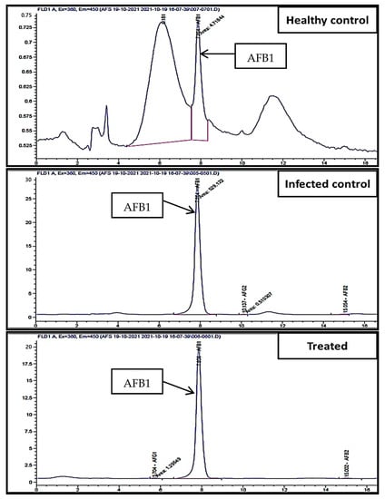 In vitro, the effect of A. fumigatus on the production of aflatoxins by A. flavus in a liquid medium was measured using HPLC methods (Figure 4). The results revealed that A. fumigatus reduced all aflatoxin types in the medium, reducing AFG1 from 6.88 to 1.40 ng/mL with 79.60% inhibition, and also reduced AFB1 from 3647.1 to 332.5 ng/mL with 90.90% inhibition. The fungal endophyte A. fumigatus has great efficiency in decreasing the most toxic and commonly occurring toxin (AFB1), which has been classified as a group Ι human carcinogen by the International Agency for Research on Cancer [65]. Furthermore, A. fumigatus reduced the production of AFB2 from 99.39 to 6.80 ng/mL, with a high inhibition value of 93.10% (Table 1). On the other hand, AFG2 was not detected, neither in the control nor treated samples.