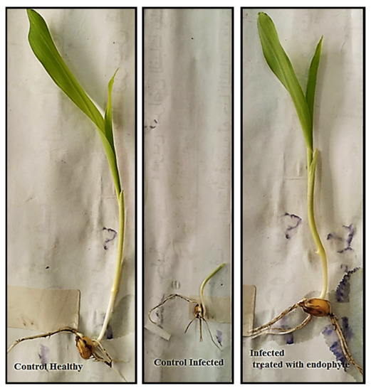 Growth characteristics of corn seedlings in different treatments: control healthy, control infected and infected treated with endophytic fungus A. fumigatus.