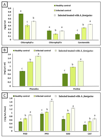Effect of A. fumigatus on (A) photosynthetic pigments (chlorophyll a, chlorophyll b and carotenoids) (mg/g fresh weight), (B) phenolics, proline (mg/g dry weight) and antioxidant enzymes (C) activity (POD, PPO, SOD, and CAT) (unit/g fresh weight/hour). Data are expressed as means ± standard deviations of triplicate assays. The different alphabetic superscripts in each item are significantly different (p < 0.05).