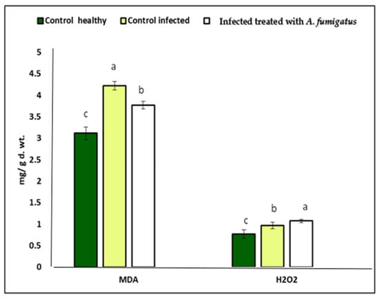 Oxidative stress caused by infection with A. flavus led to a serious disturbance in plant cells and raised the production of H2O2, as well lipid peroxidation (MDA), in the leaves of corn plants. Here, the infection with A. flavus led to increased oxidative stress markers, i.e., MDA and H2O2 (35.36 and 40.2%, respectively), compared to uninfected corn plants (Figure 8). On the other hand, the content of MDA and H2O2 declined in response to A. fumigatus treatment by 10.66% and 10.18%, respectively, compared to infected corn plants (Figure 8). In this regard, the application of A. fumigatus reduced oxidative damage by inducing antioxidant properties that scavenge ROS and prevent oxidative stress from affecting the cellular membranes [86,87].
