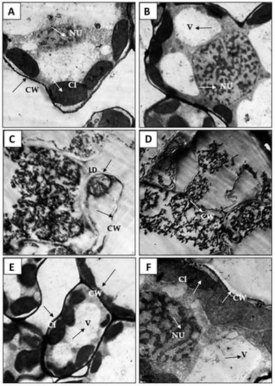Ultra-micrograph sections of corn (Zea mays L.) showing leave cells, healthy (A,B), where thickened cell wall (CW) is clear compared with untreated, infected. There was a noticeable lack in the differentiation (LD) of the cells, cracking, and lysis in the cell wall and destruction in the nucleus (C,D); also, a presence of thickening in the cell wall (CW) was noticed in treated sample (E,F).